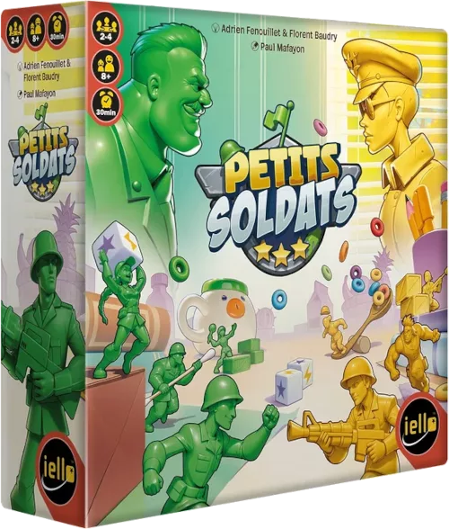 Dans Petits Soldats, deux armées de soldats en plastique s’affrontent sur la table, utilisant les assiettes, les verres et tout ce qui se trouve à proximité comme abri ou comme points d’observation. Déplacez vos personnages, attaquez vos ennemis, cachez-vous derrière le beurrier et utilisez vos cartes pour des actions spéciales.
