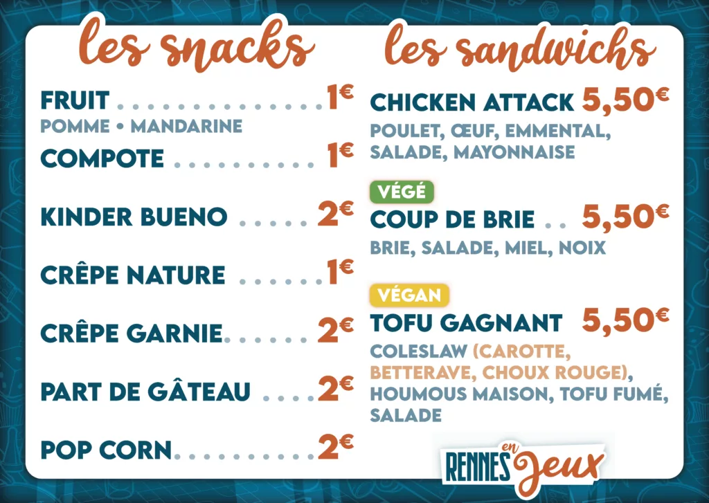 Si vous avez une petite faim ou une soif à étancher entre vos parties de jeu, c’est à la buvette qu’il faut passer ! Venez nous voir au rez-de-chaussée ! Vous pouvez payer en espèces et par carte bancaire. Les verres sont consignés à 1€.